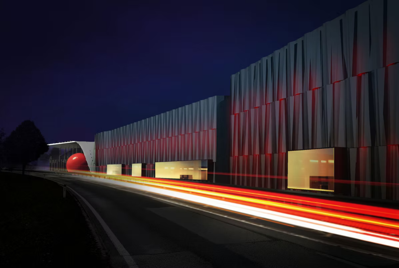 Zusätzlich wurde das Prinzip nicht linear, sondern parametrisch weitergedacht: Die Lamellen folgen einer organisch geschwungenen Bewegung, die die Dynamik der Straße, den Fluss des Verkehrs und die Geschwindigkeit im architektonischen Ausdruck spürbar macht.