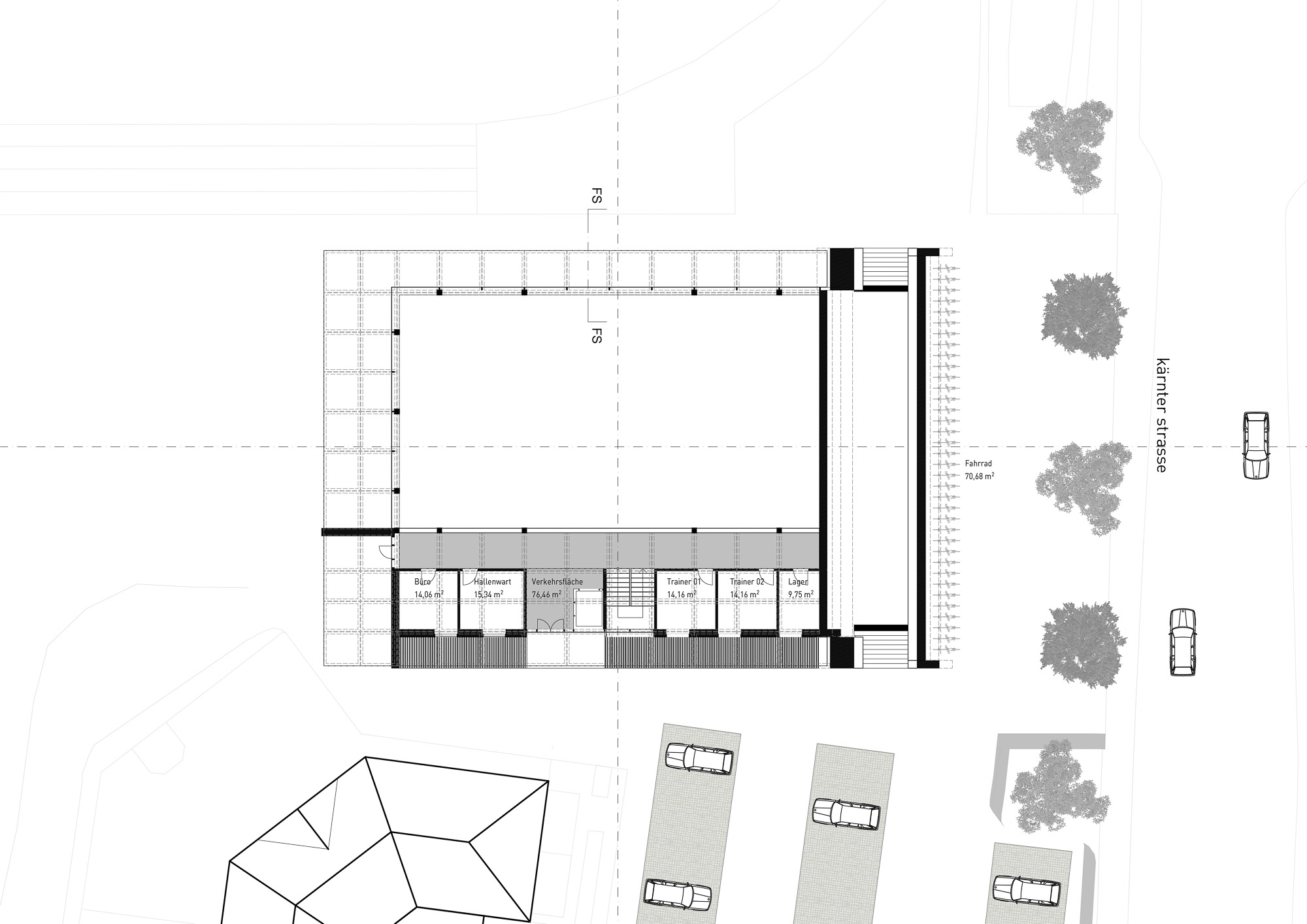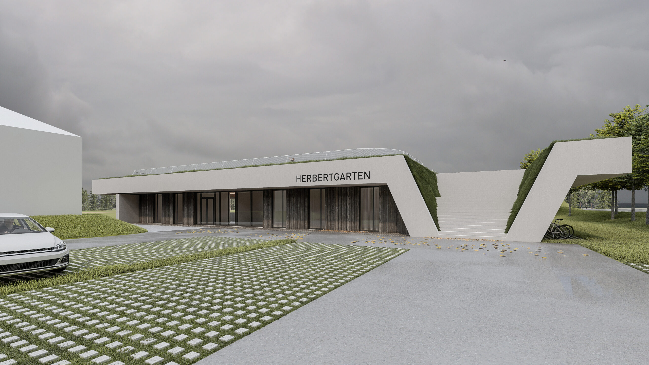 Eine Sporthalle, die halb im Boden steckt und oben ein grünes Sonnendeck trägt? Genau das ist das Forum Herbertgarten in Klagenfurt. Statt einem wuchtigen Klotz haben wir den Baukörper teilweise in die Landschaft versenkt. So bleibt der Blick frei, die Halle kühlt sich im Sommer besser – und oben drauf gibt’s einen begehbaren Park mit Aussicht.