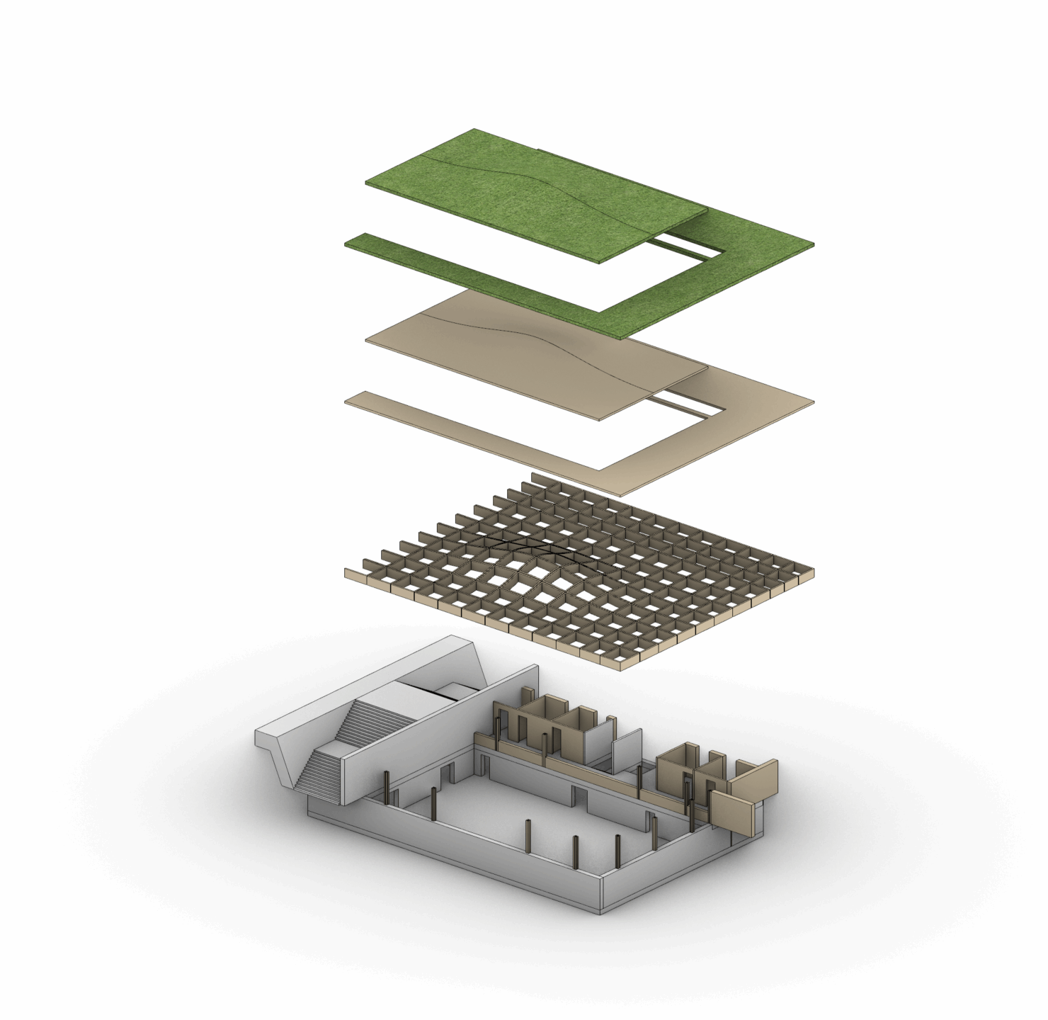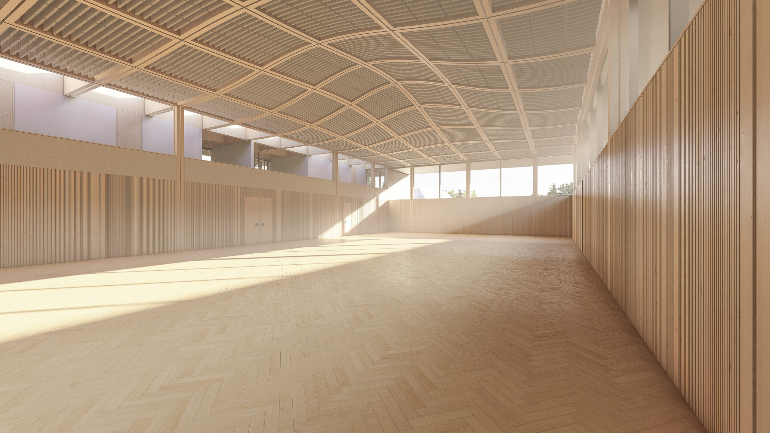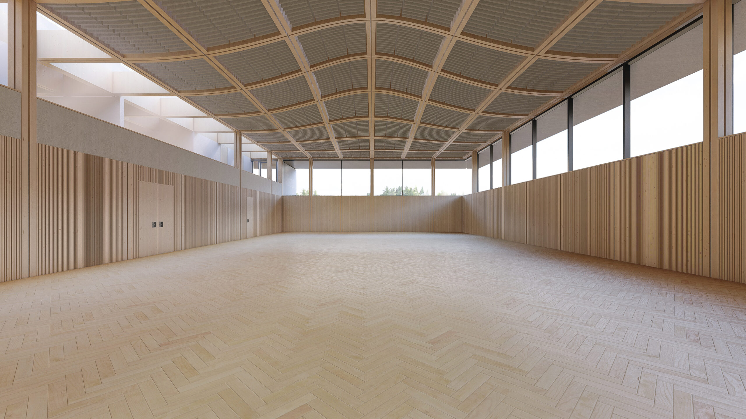 Innen sorgt die geschwungene Dachform für spannende Räume, viel Licht und immer neue Ausblicke. Außen fügt sich die Halle zurückhaltend, aber mit starker Geste in den Park ein – leicht, aber mit Charakter.
