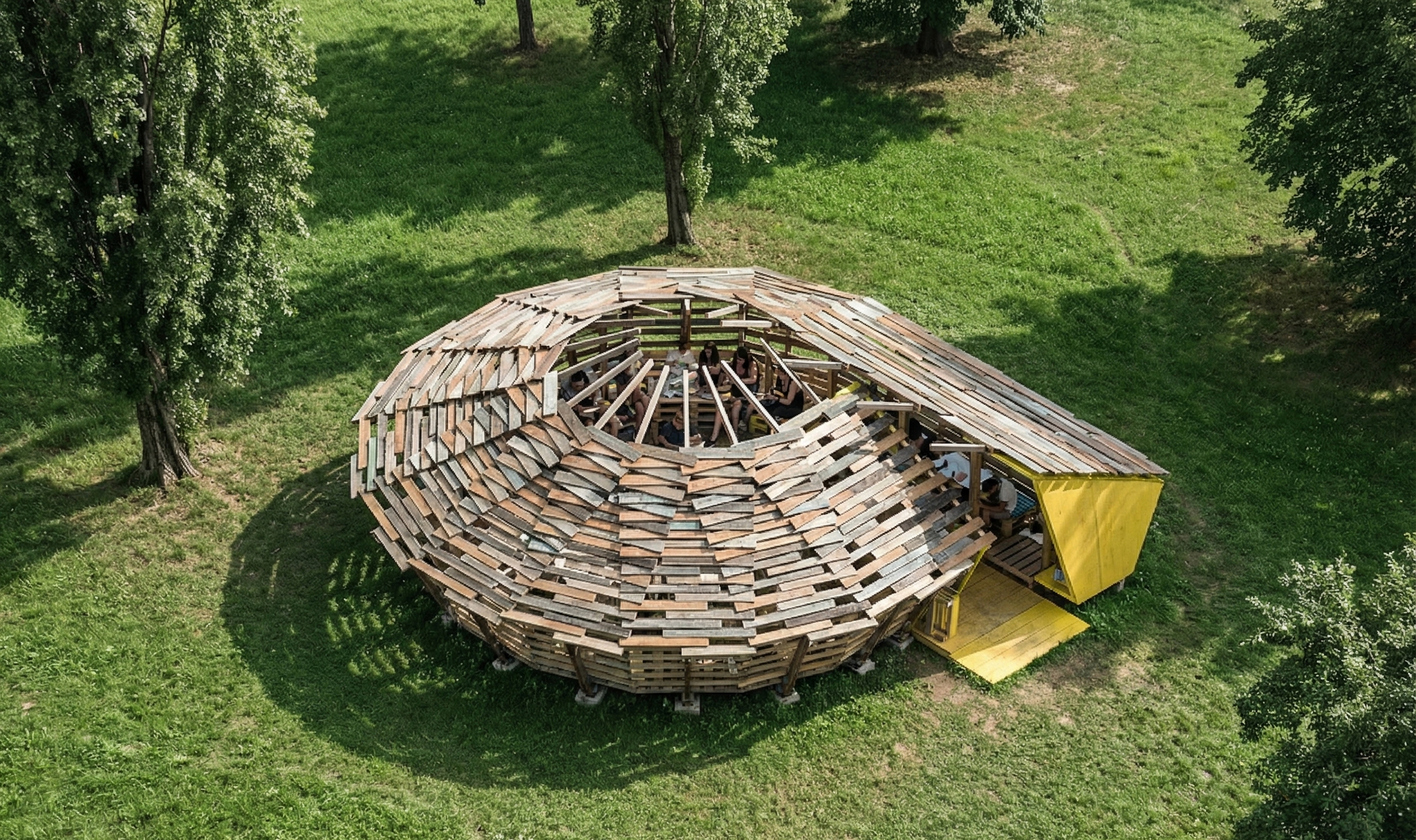 Der Pavillon ist ein Gemeinschaftsprojekt, bei dem Reparieren, Schrauben, Sammeln und Improvisieren ausdrücklich erwünscht sind.