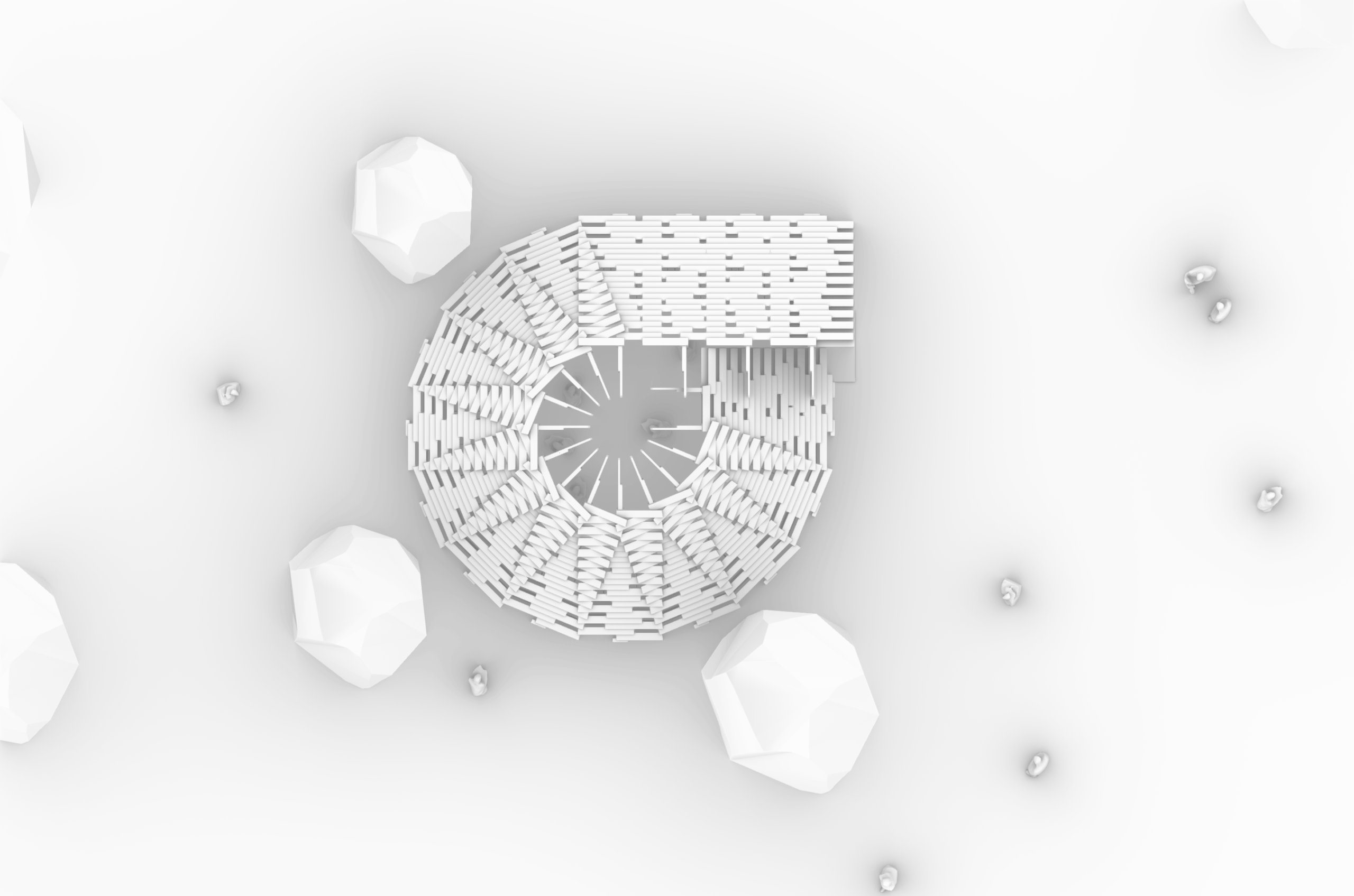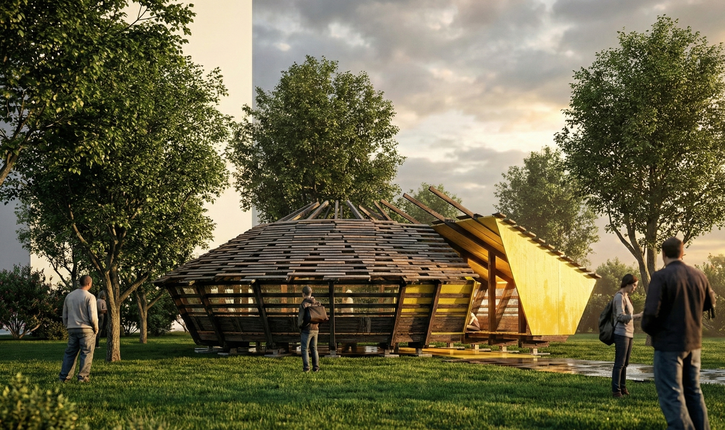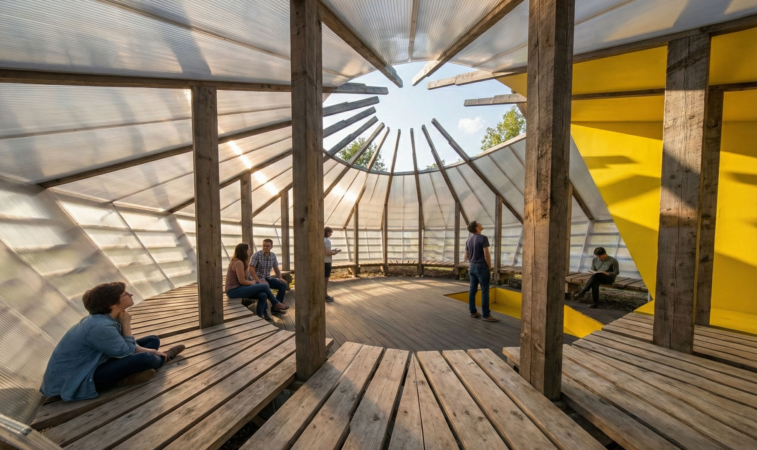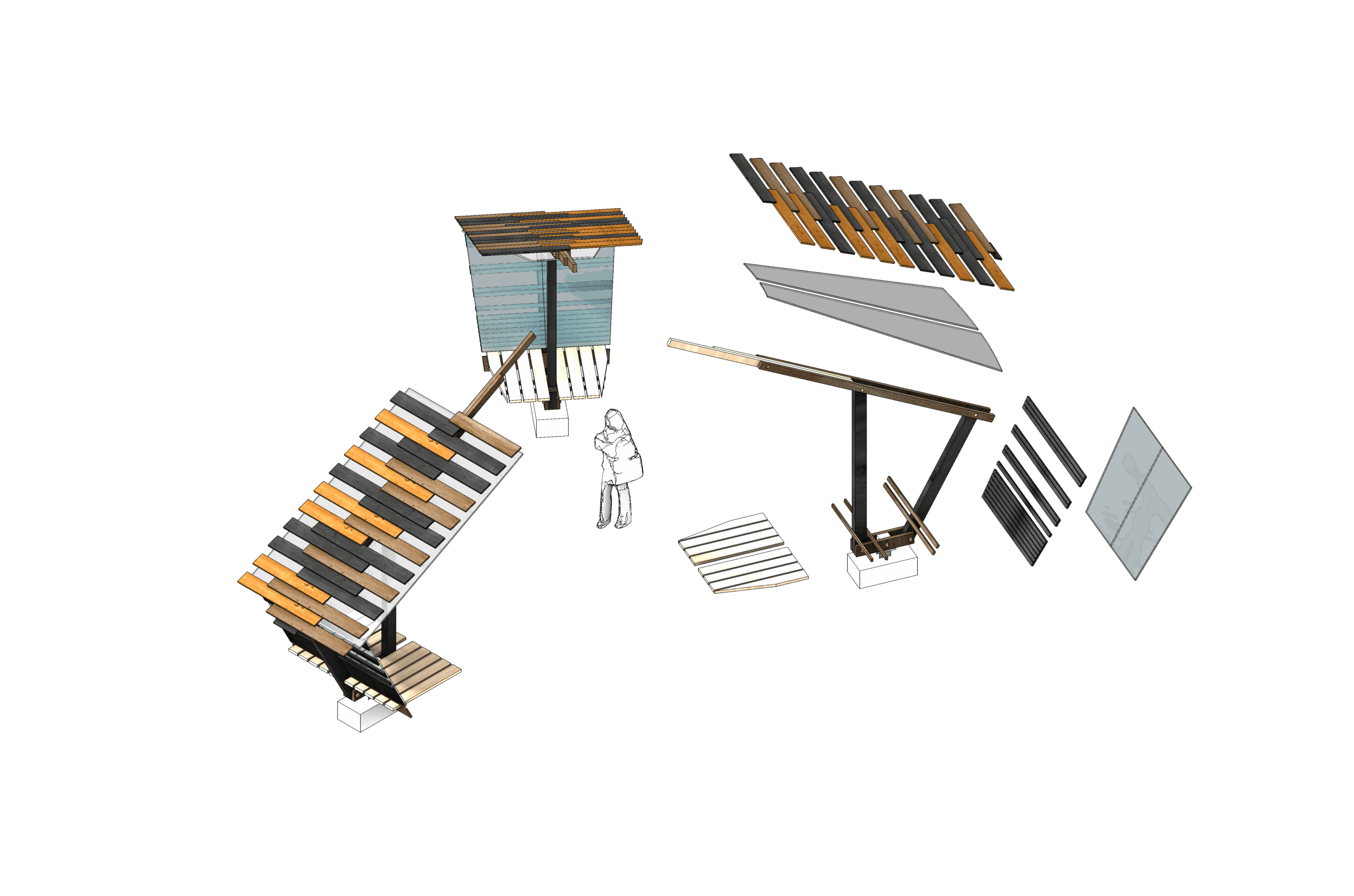 Der Raum wird aus einem einzigen Basiselement entwickelt, das sich drehen, spiegeln und erweitern lässt. Wie auf Seite 9 des PDFs sichtbar, entsteht durch die radiale Anordnung der Elemente eine runde, wettergeschützte Struktur – ein kleiner Pavillon, der gleichzeitig offen, atmosphärisch und robust ist
