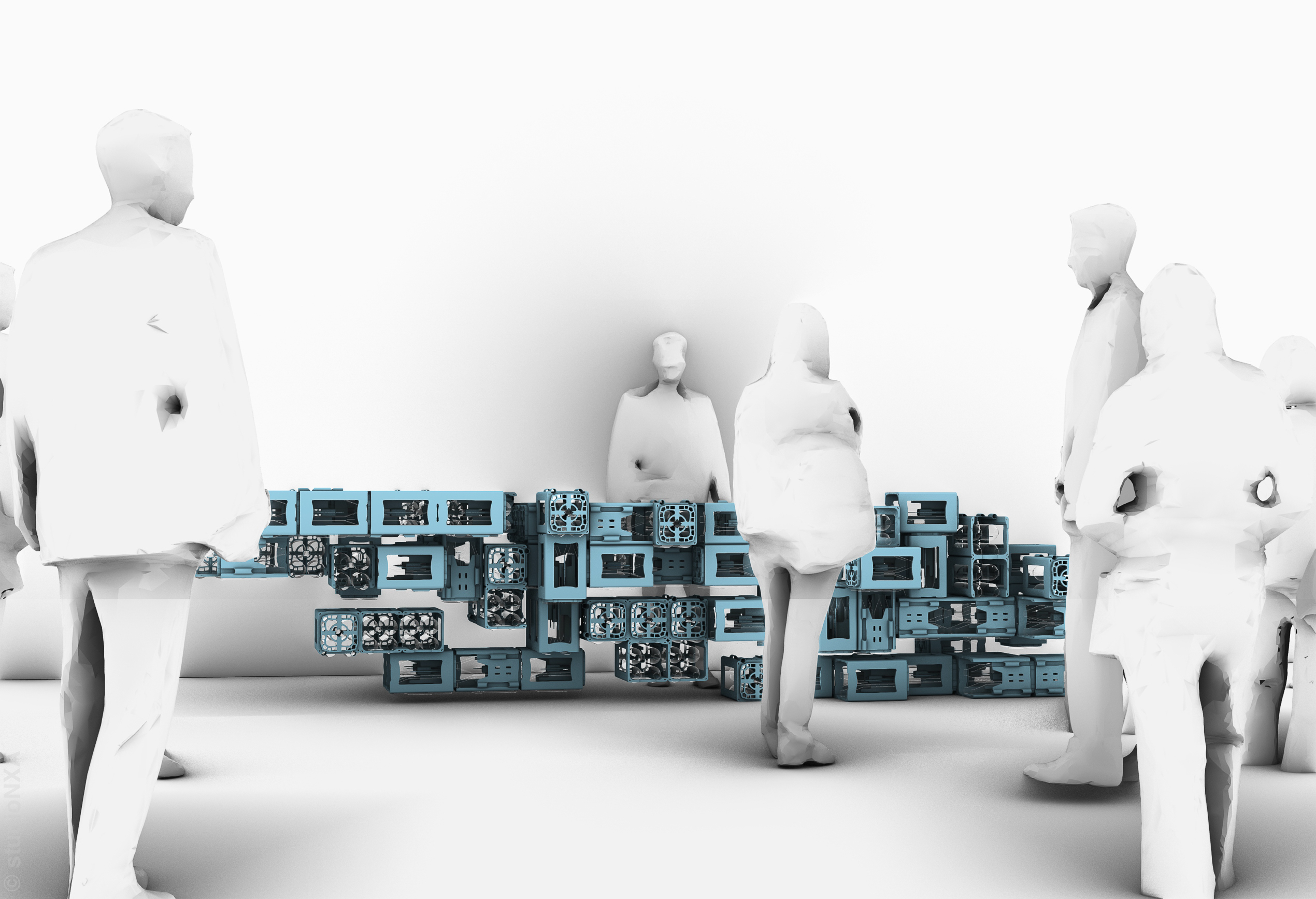 Die Vöslauer Mehrwegkiste ist eigentlich schon ein praktischer Klassiker. Aber was, wenn man sie nicht nur zum Tragen von Flaschen nutzt, sondern zu einem Bausystem macht? Genau das war die Idee: Mit zwei simplen Verbindungselementen (aus Holz oder 3D-gedrucktem Recycling-Plastik) lassen sich die Kisten stapeln, drehen und kombinieren – bis daraus ganz neue Formen entstehen.