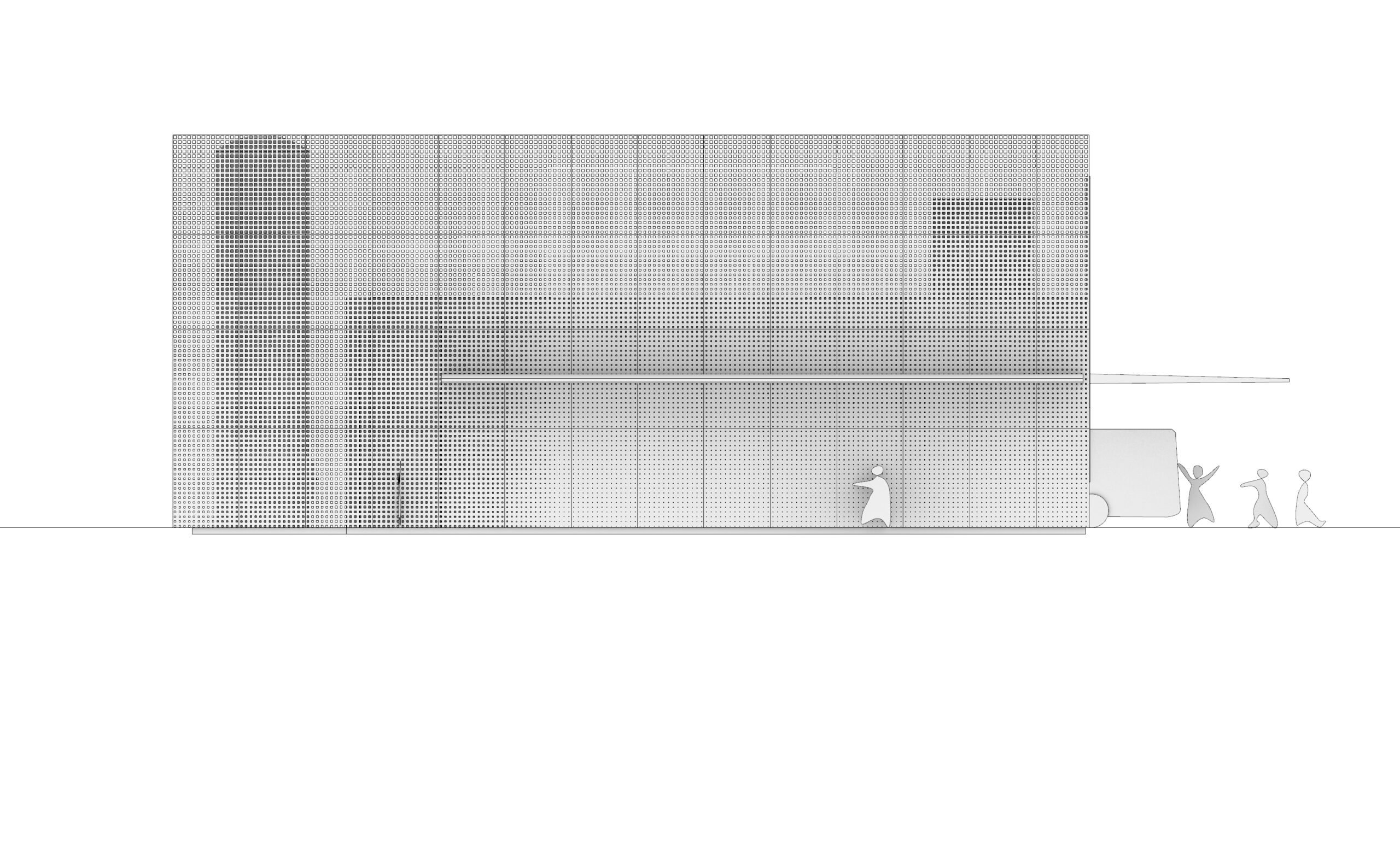 Im Fußgängerbereich (unten rechts): Der Verlauf verdichtet sich nach unten hin zu einer fast geschlossenen, opaken Fläche. Dies schafft auf Augenhöhe eine ruhige, haptische Wand, die die technische Anlage vom öffentlichen Raum abschirmt und den menschlichen Maßstab wahrt.